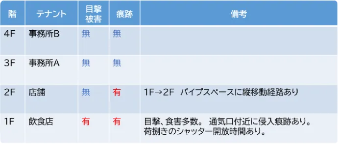 複合商業ビルの管理会社から、ネズミの目撃情報があったため調べてほしいと依頼がある。 半日がかりでネズミ総合診断を実施し、調査結果と対策方法を提案