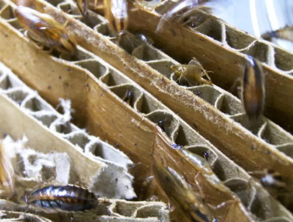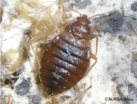 別名南京虫と呼ばれます。大きさは約5㎜程度の虫ですが、一度建物に侵入すると防除が難しい吸血害虫です。衣類や荷物に付着して拡散するため、宿泊施設では早期発見が重要です。当社では犬の嗅覚を利用した点検作業も行っています。